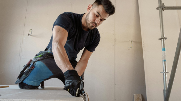 Handwerker der eine Gipskartonplatte für den Trockenbau zuschneidet